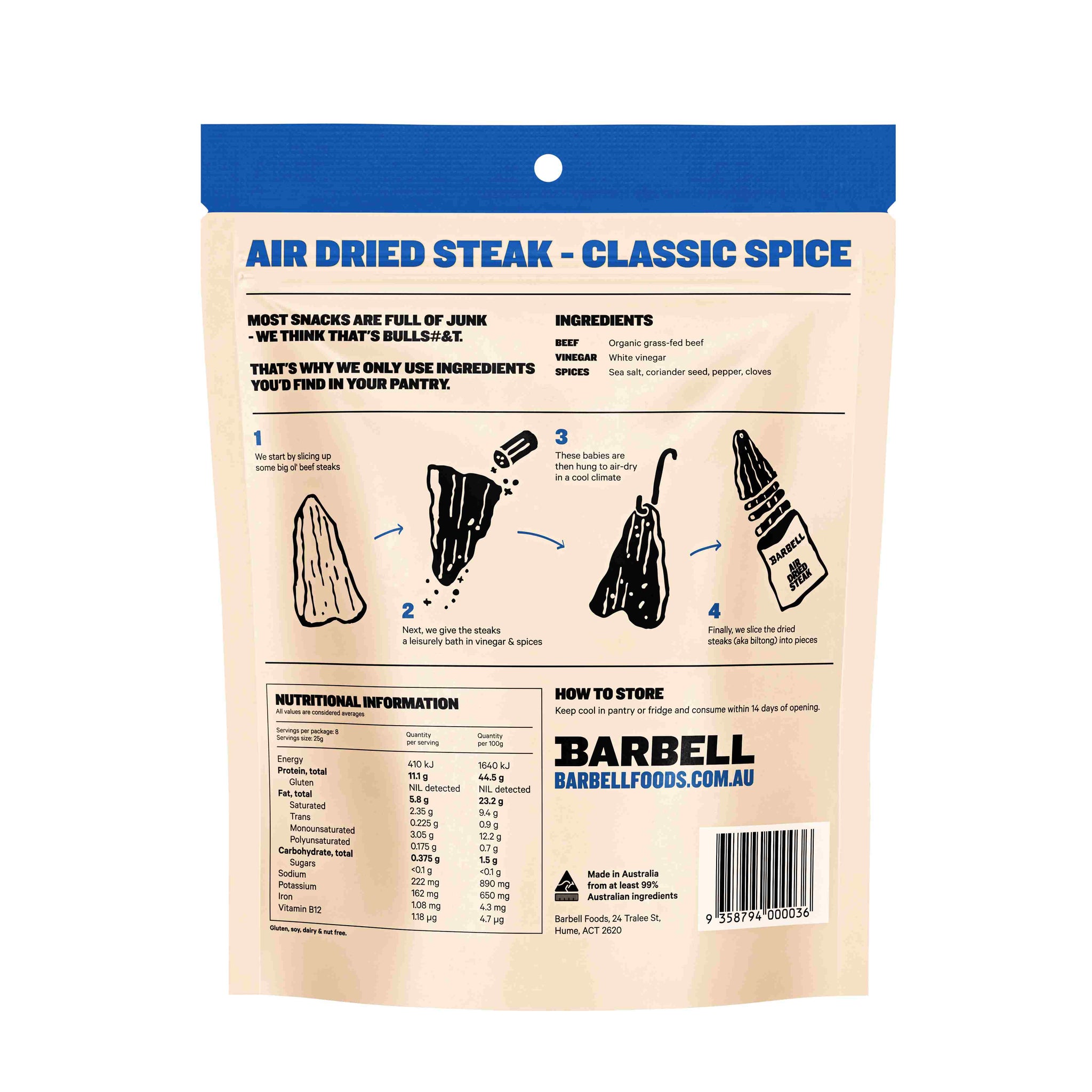 Organic grass-fed & finished Australian beef, gluten-free white vinegar, sea salt, coriander seeds, black pepper, cloves and cayenne pepper.